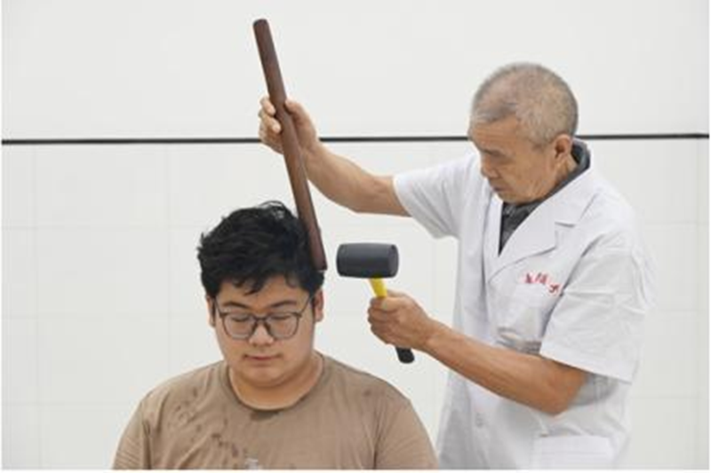 胡生军在为患者检查。患者自诉头部沉重、胀痛感,胡生军嘱患者取坐位,将木棒放于患者头部,用皮锤轻轻敲击木棒,边敲击边移动,检查头部经筋脉络是否通畅及是否有心脑血管疾病。
