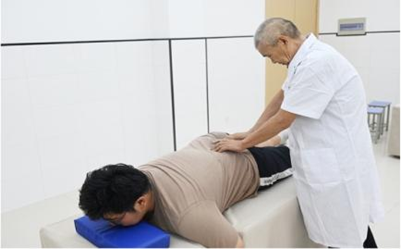 胡生军在为患者治疗。患者自诉扭伤后腰部疼痛、活动受限,胡胜军嘱患者取俯卧位,用双手按压患者腰椎和骶髂关节,查看有无小关节紊乱,运用摩、滚、推、挤手法对该部位的进行治疗。