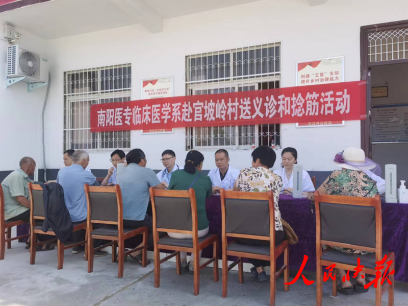 2023 年 6 月 10 日,南阳医专临床医学系党总支书记秦玖刚带领服务团队赴方城县官坡岭村开展乡村医疗服务活动。临床医学系党总支成员、南阳市著名心血管病专家张占海、“胡氏捻筋”非遗文化传承班优秀学员参加此次活动。服务团在官坡岭村村部搭建临时诊台,成立了由内科、外科、儿科、中医、心电图等专家组成的医师团队。前来就诊的村民络绎不绝,医师团队热情耐心地为村民们进行诊疗,讲授疾病预防知识,留下联系方式,为就诊群众开辟后期就诊的绿色通道。我系“胡氏捻筋”班的优秀学子为患有颈肩腰腿痛的村民们进行了特色捻筋保健理疗。
