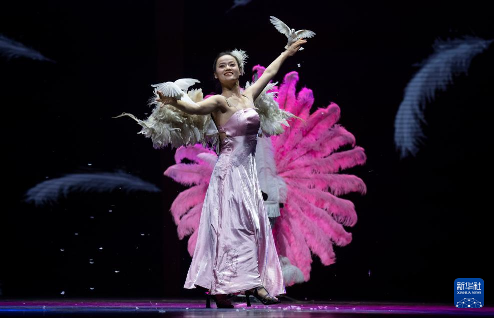 10月25日,在北京二七剧场举行的“艺苑撷英——2025年全国优秀青年艺术人才展演”上,射阳县杂技团演员表演魔术《羽》。新华社记者 才扬 摄
